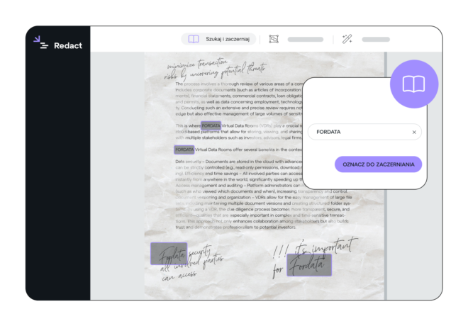 Skany niskiej jakości, rozmyte litery, nieczytelne dokumenty? Nasz OCR poradzi sobie tam, gdzie inne systemy się poddają. Dodatkowo bez względu na to, jak dokument został wgrany do Redact – bokiem, do góry nogami czy z mieszanym układem stron – OCR poprawnie odczyta jego zawartość. Problemu nie stanowi również rozpoznawanie pisma odręcznego. Funkcja, która ma ogromne znaczenie w przypadku podpisów, odręcznych adnotacji i notatek. Teraz również te informacje staną się przeszukiwalne, a także możliwe do anonimizacji.